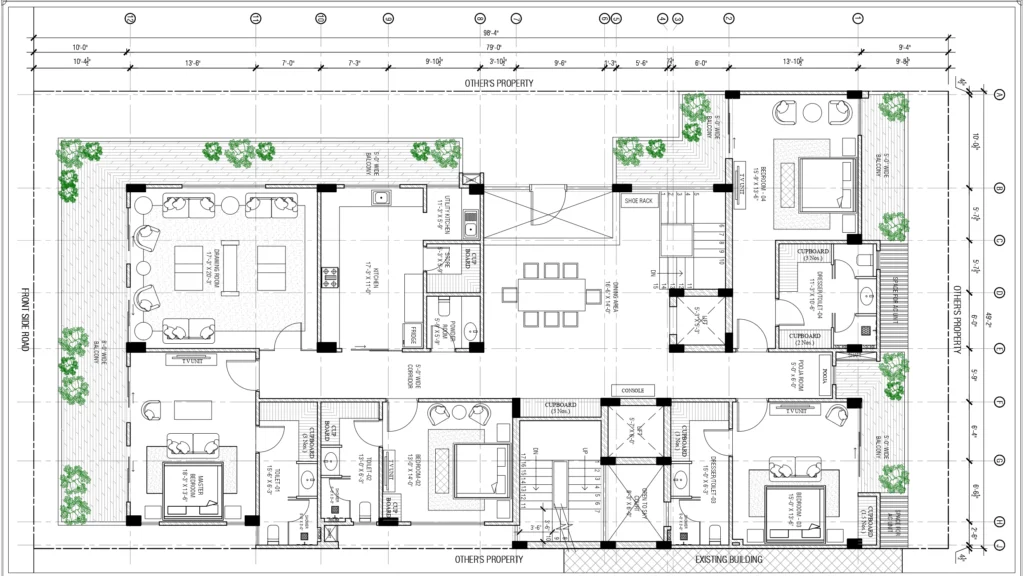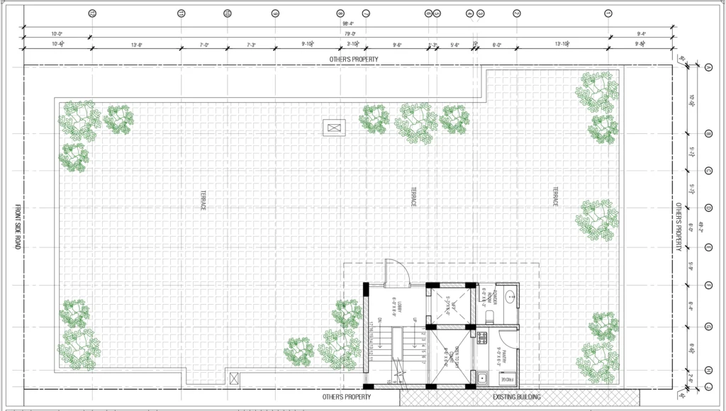 The top of the building, left open on purpose. A sprawling terrace ringed with mature trees offers a rare kind of quiet – open sky above, greenery all around, and the city at a comfortable distance. A compact service room and pantry ensure the space works as effortlessly as it feels. Whether it’s a morning ritual or an evening under the stars, this is where the building exhales.