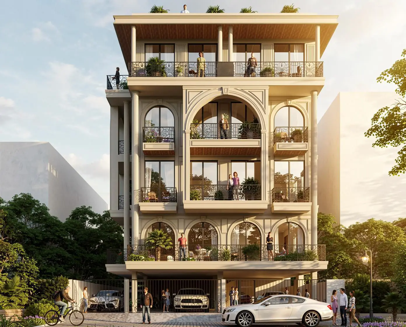 Where the home truly begins. The first floor is laid out across two thoughtfully separated residences – each with its own living room, dining space, bedrooms, and private balconies framed by greenery. The master suite on one side commands its own quiet corner, while every bedroom comes with dedicated storage and attached baths. A shared staircase connects without intruding.
