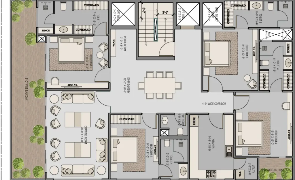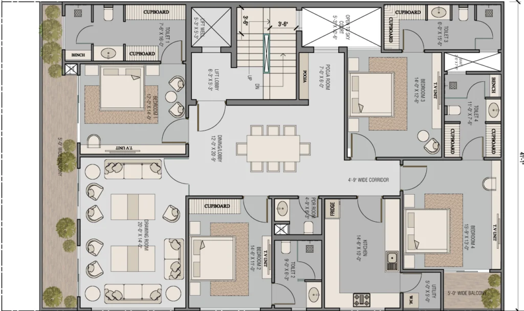 - Configuration: 4 BHK + Drawing + Dining + Pooja + Powder + Kitchen + Utility